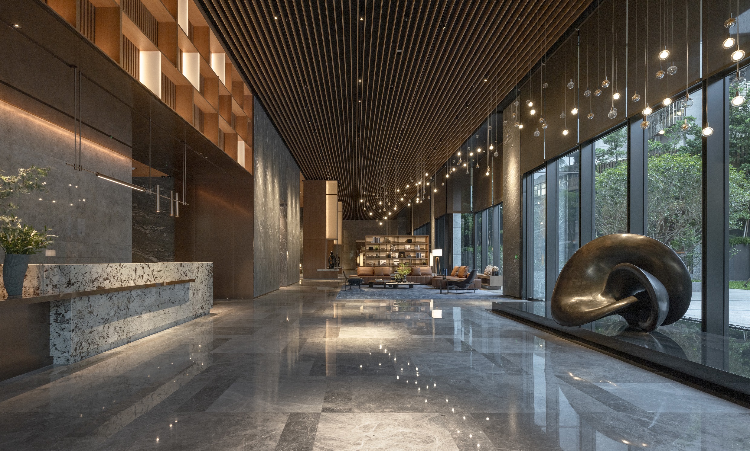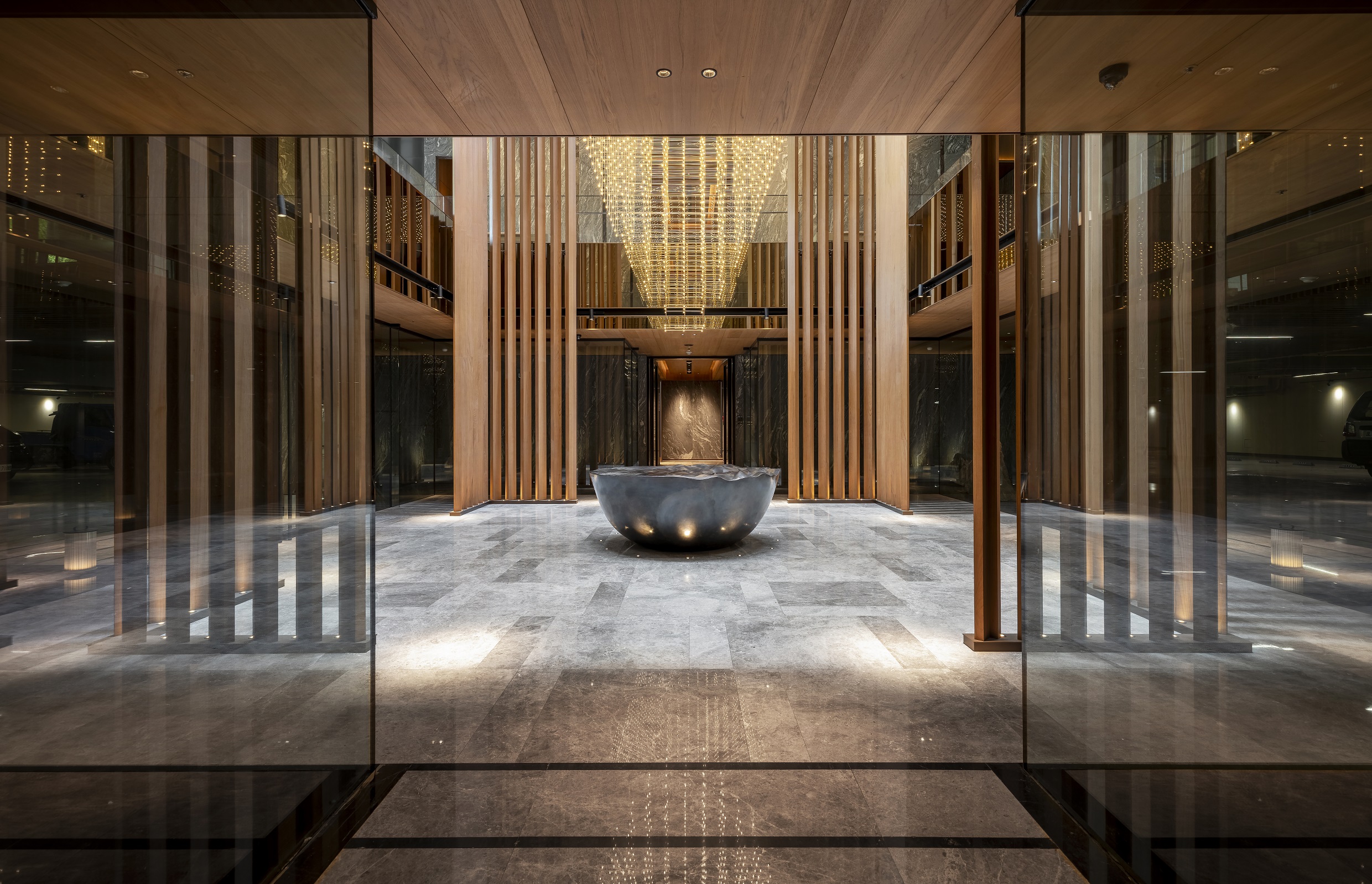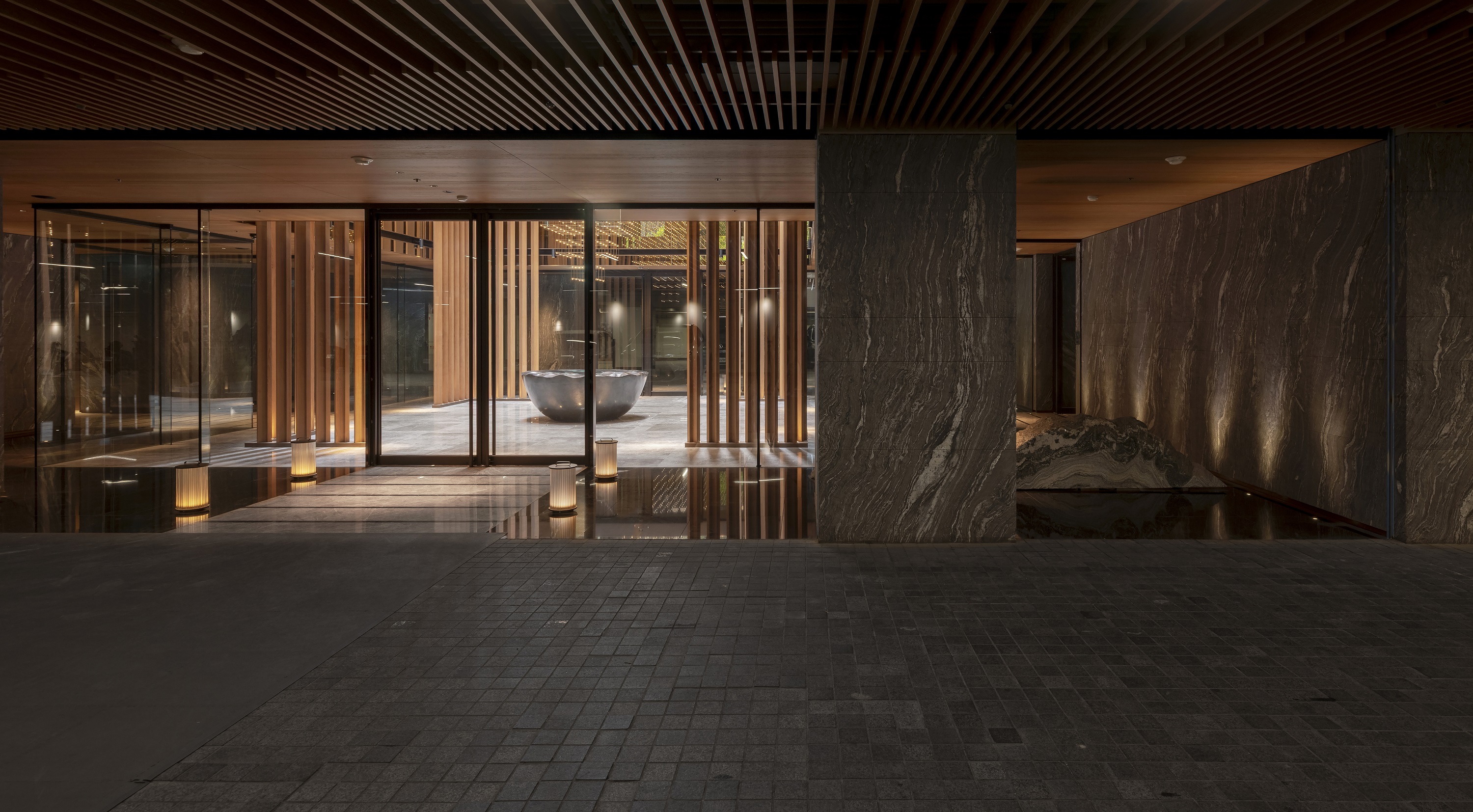 The 58-meter deep reception hall is a glass box floating on the water. The light art leads the way home. The central atrium is surrounded by dark slates. Skylight flows into the atrium and runs through to the second entrance hall of basement. The space reflects the change of the four seasons.