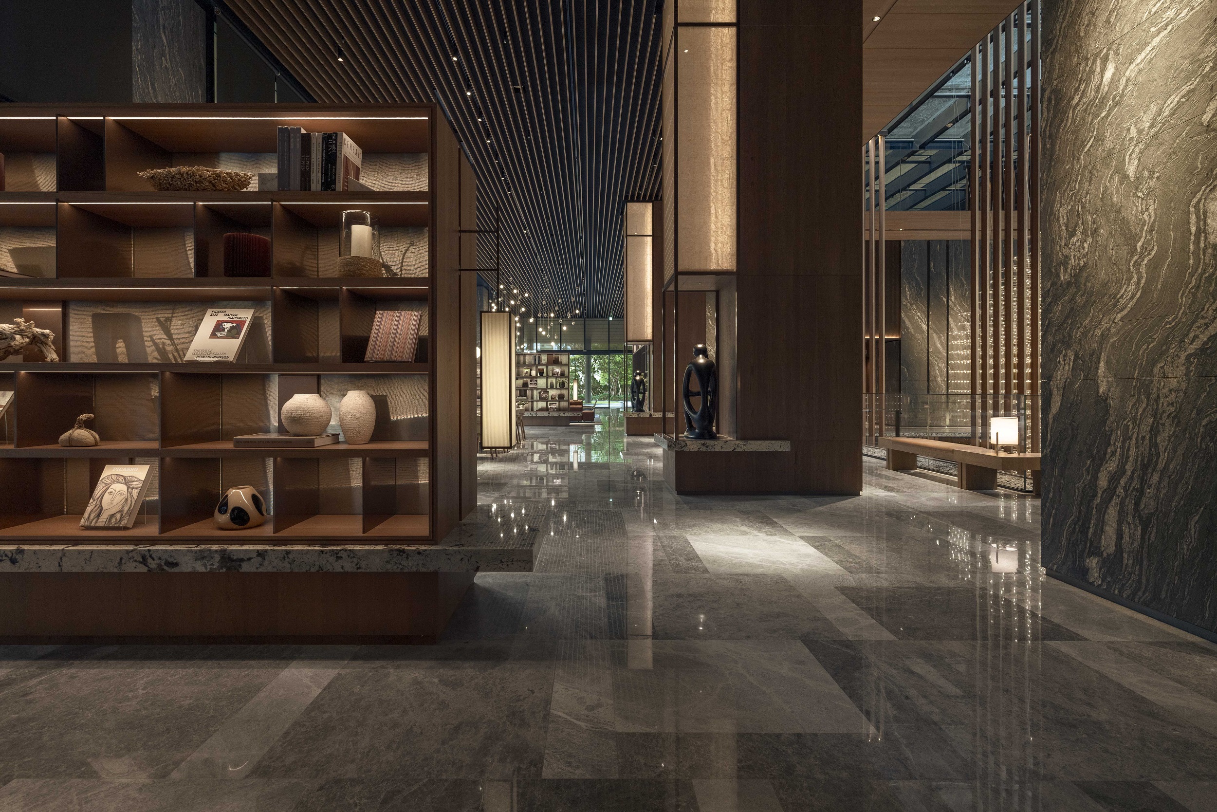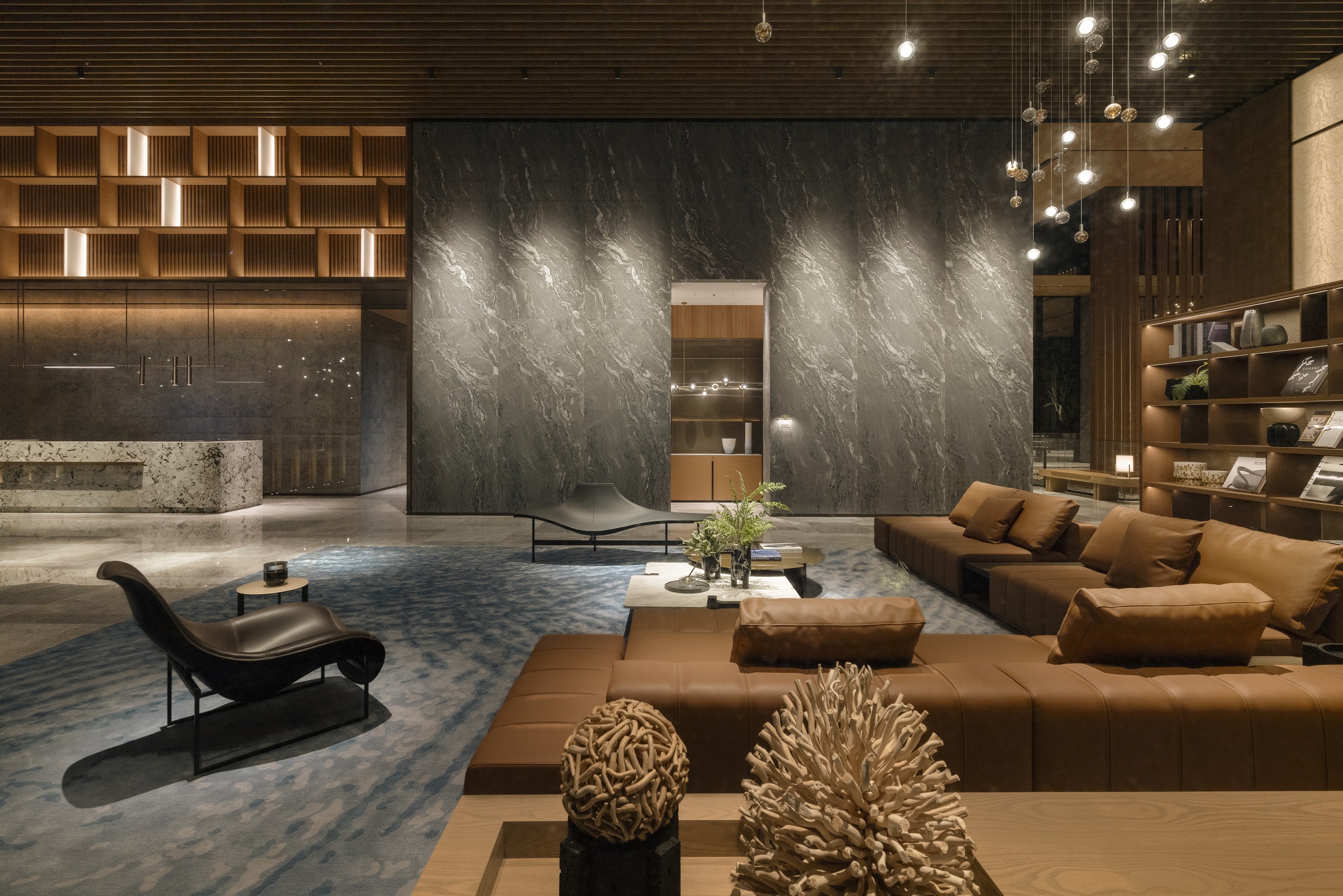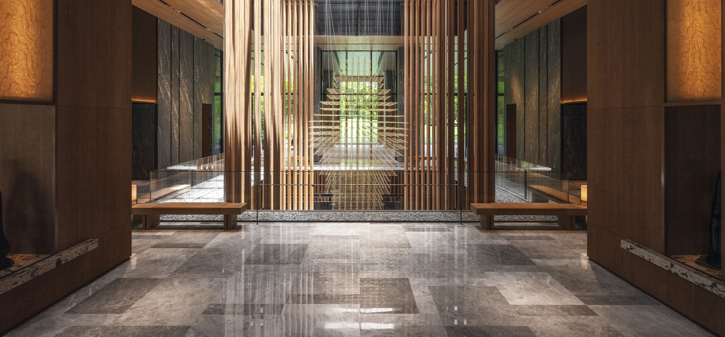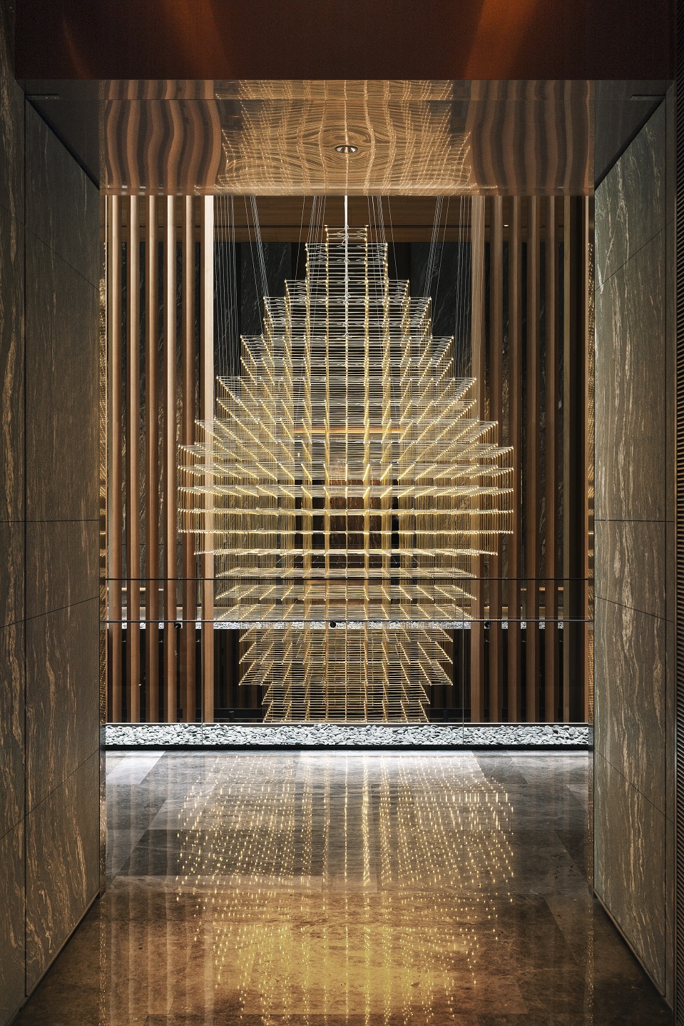 The 58-meter deep reception hall is a glass box floating on the water. The light art leads the way home. The central atrium is surrounded by dark slates. Skylight flows into the atrium and runs through to the second entrance hall of basement. The space reflects the change of the four seasons.